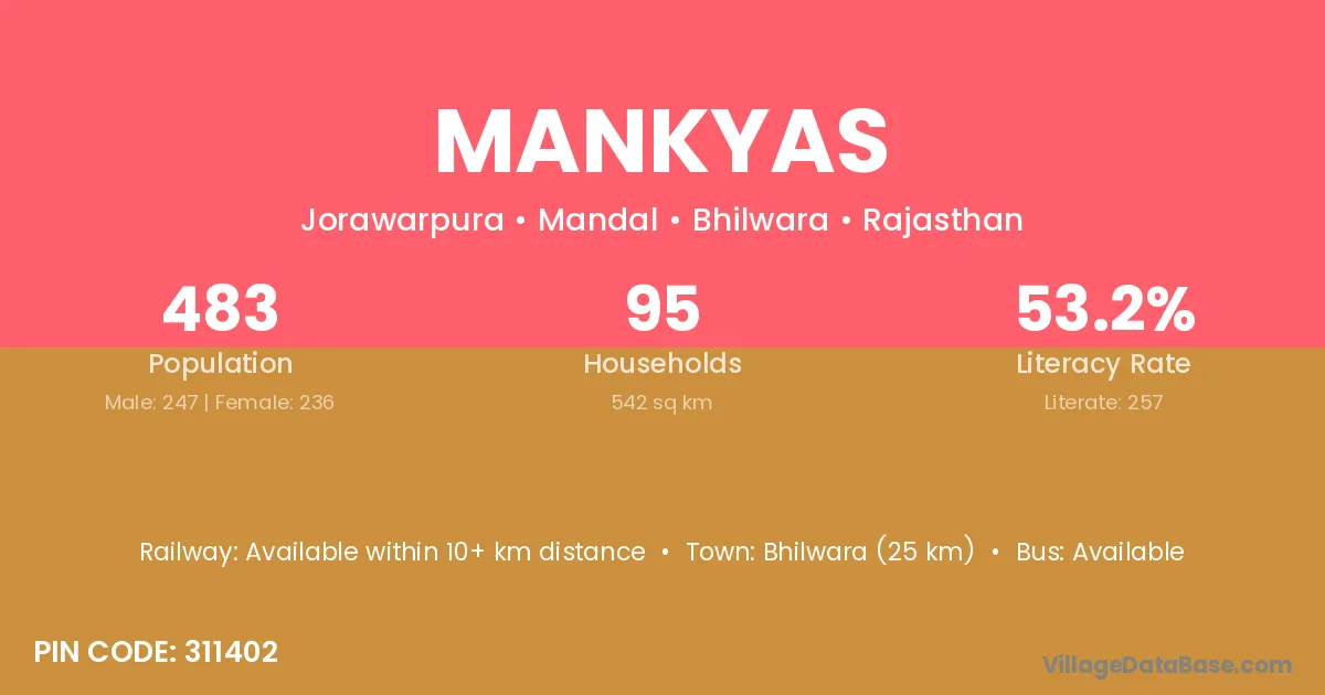Bhilwara (25 km) is the nearest town to Mankyas village for major economic activities and is located approximately 25 km away.