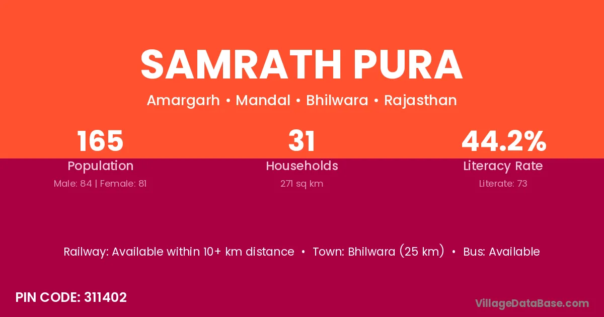 Bhilwara (25 km) is the nearest town to Samrath Pura village for major economic activities and is located approximately 25 km away.