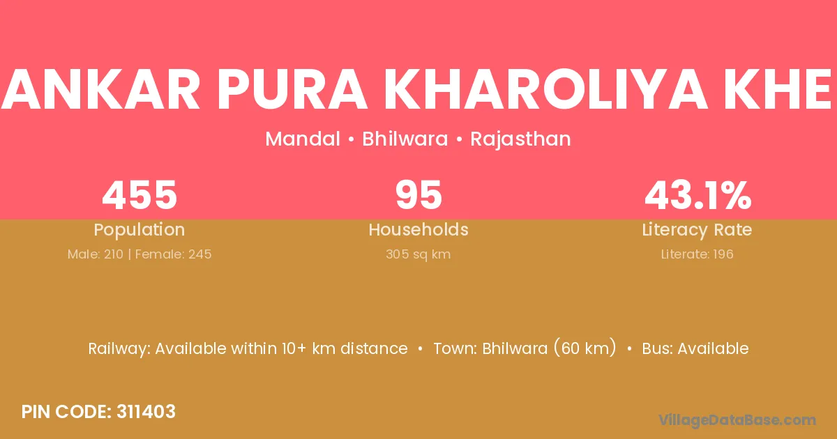 Shankar Pura Kharoliya Khera village has a total population of 455 people, of which 210 are males and 245 are females.