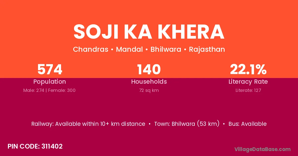 Bhilwara (53 km) is the nearest town to Soji Ka Khera village for major economic activities and is located approximately 53 km away.