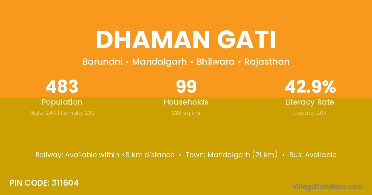 Mandalgarh (21 km) is the nearest town to Dhaman Gati village for major economic activities and is located approximately 21 km away.