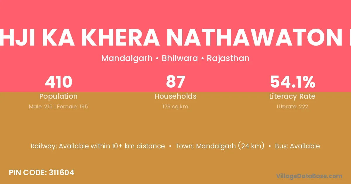 Harisinghji Ka Khera Nathawaton Ka Khera village has a total population of 410 people, of which 215 are males and 195 are females.