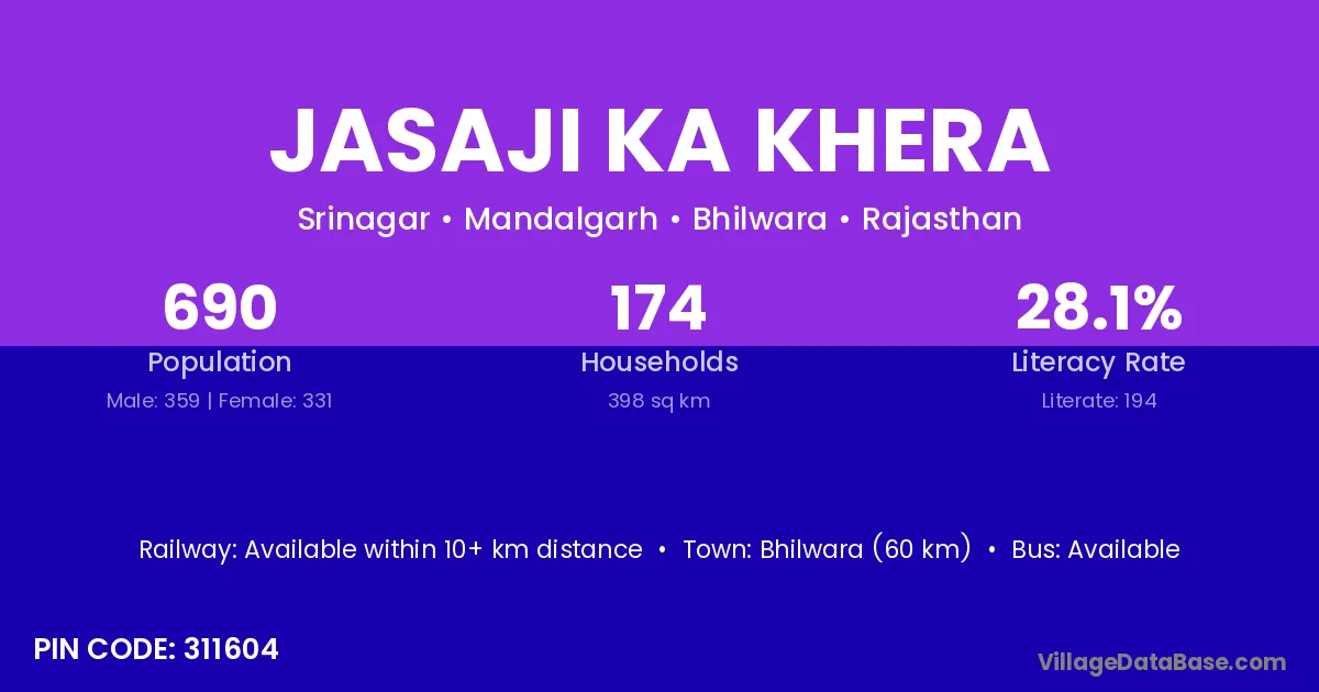 Jasaji Ka Khera village has a total population of 690 people, of which 359 are males and 331 are females.