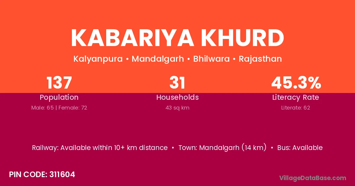 Mandalgarh (14 km) is the nearest town to Kabariya Khurd village for major economic activities and is located approximately 14 km away.