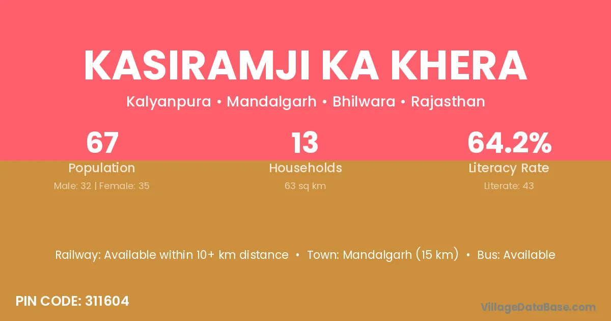 Kasiramji Ka Khera village has a total population of 67 people, of which 32 are males and 35 are females.