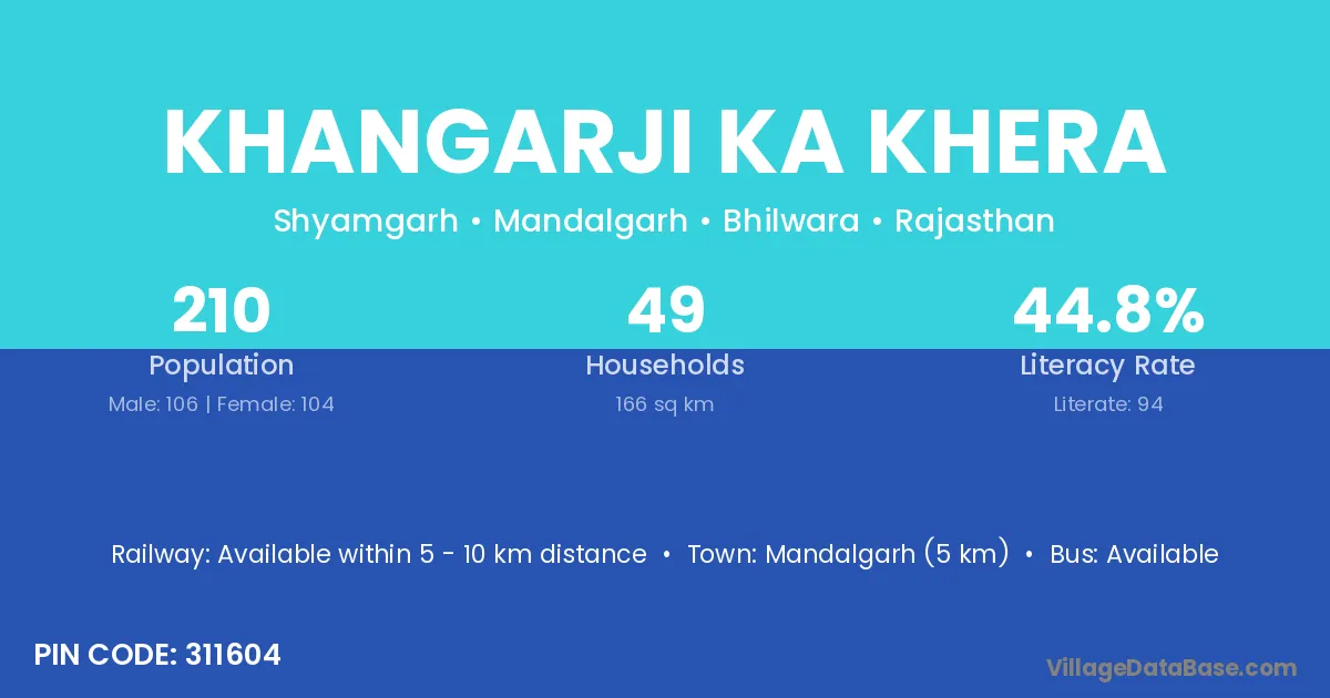 Mandalgarh (5 km) is the nearest town to Khangarji Ka Khera village for major economic activities and is located approximately 5 km away.