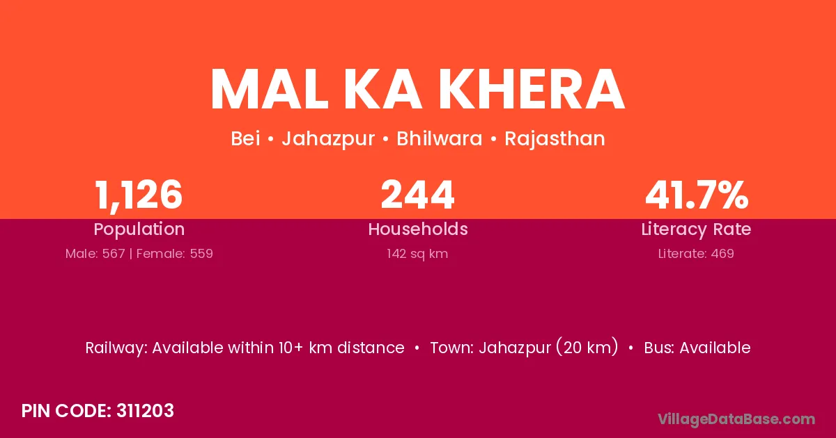 Mandalgarh (35 km) is the nearest town to Mal Ka Khera village for major economic activities and is located approximately 35 km away.