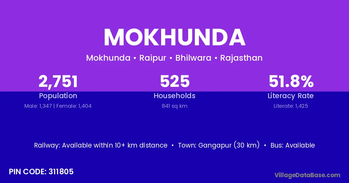 Gangapur (30 km) is the nearest town to Mokhunda village for major economic activities and is located approximately 30 km away.
