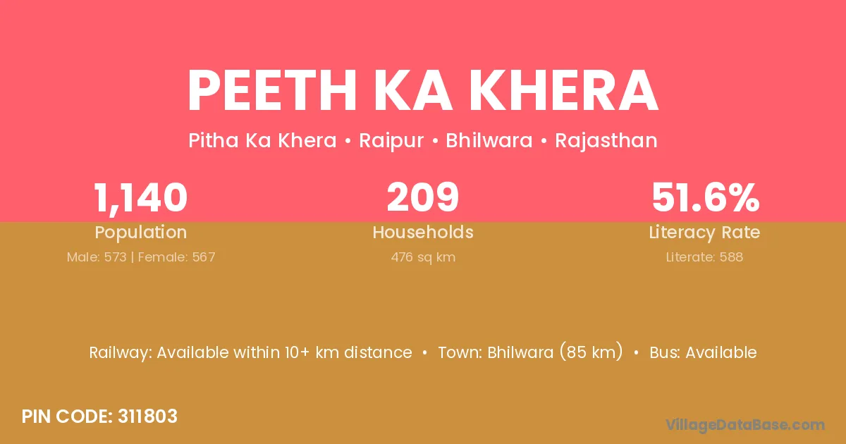 Bhilwara (85 km) is the nearest town to Peeth Ka Khera village for major economic activities and is located approximately 85 km away.