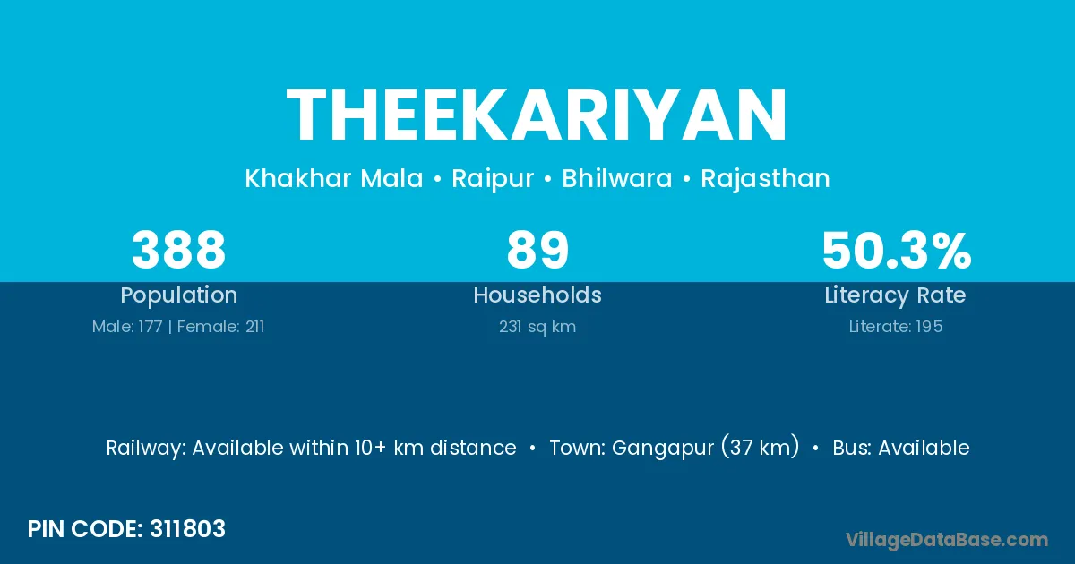 Gangapur (37 km) is the nearest town to Theekariyan village for major economic activities and is located approximately 37 km away.