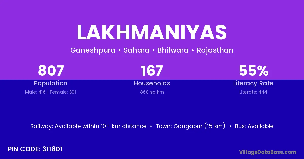 Gangapur (15 km) is the nearest town to Lakhmaniyas village for major economic activities and is located approximately 15 km away.