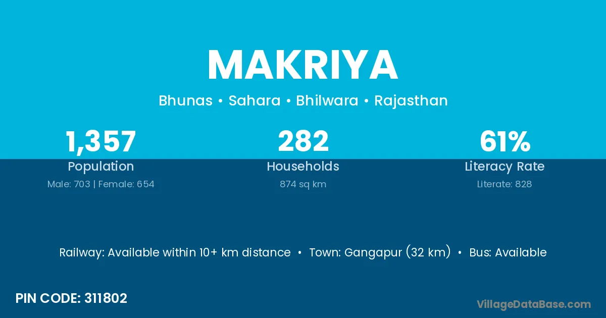 Gangapur (32 km) is the nearest town to Makriya village for major economic activities and is located approximately 32 km away.