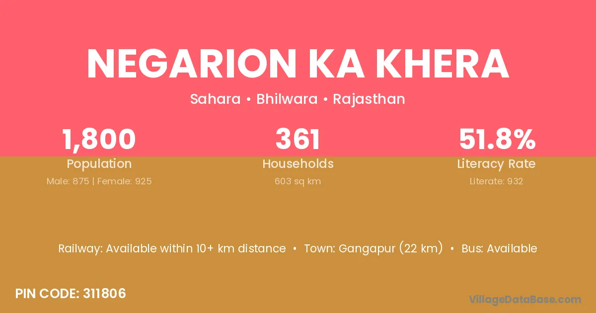 Gangapur (22 km) is the nearest town to Negarion Ka Khera village for major economic activities and is located approximately 22 km away.