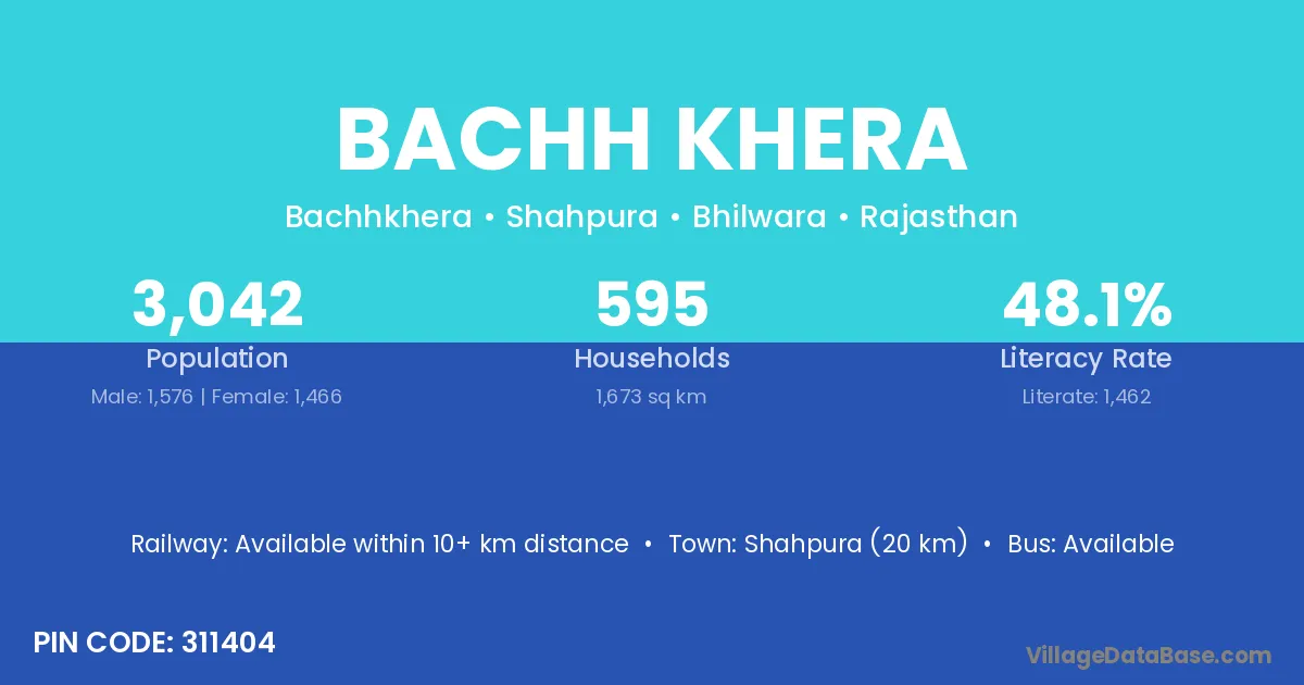 Shahpura (20 km) is the nearest town to Bachh Khera village for major economic activities and is located approximately 20 km away.