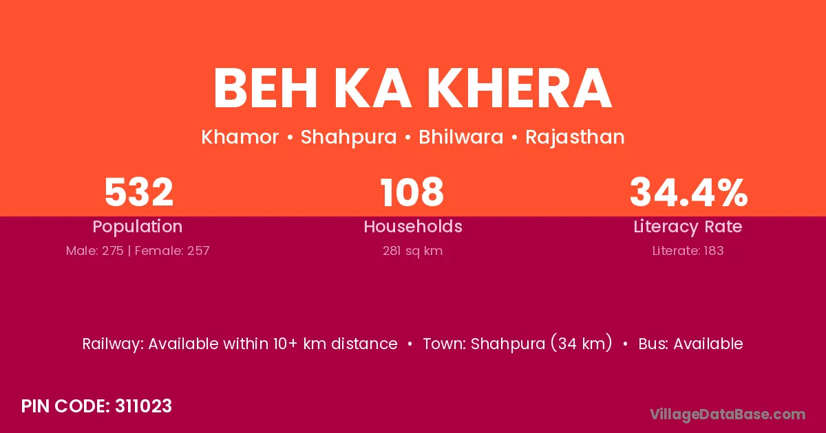 Shahpura (34 km) is the nearest town to Beh Ka Khera village for major economic activities and is located approximately 34 km away.