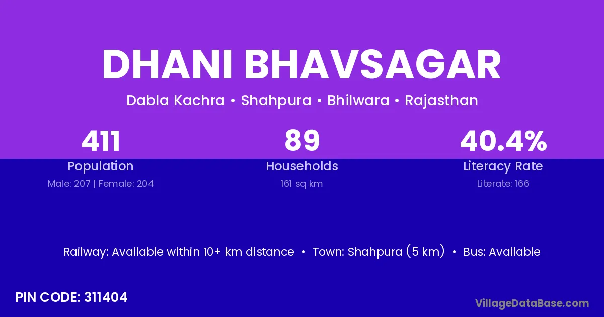 Dhani Bhavsagar village has a total population of 411 people, of which 207 are males and 204 are females.