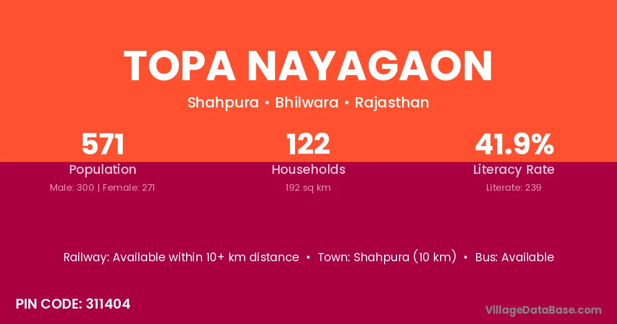 Shahpura (10 km) is the nearest town to Topa Nayagaon village for major economic activities and is located approximately 10 km away.