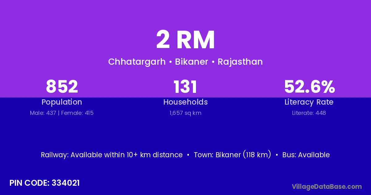 2 Rm village has a total population of 852 people, of which 437 are males and 415 are females.