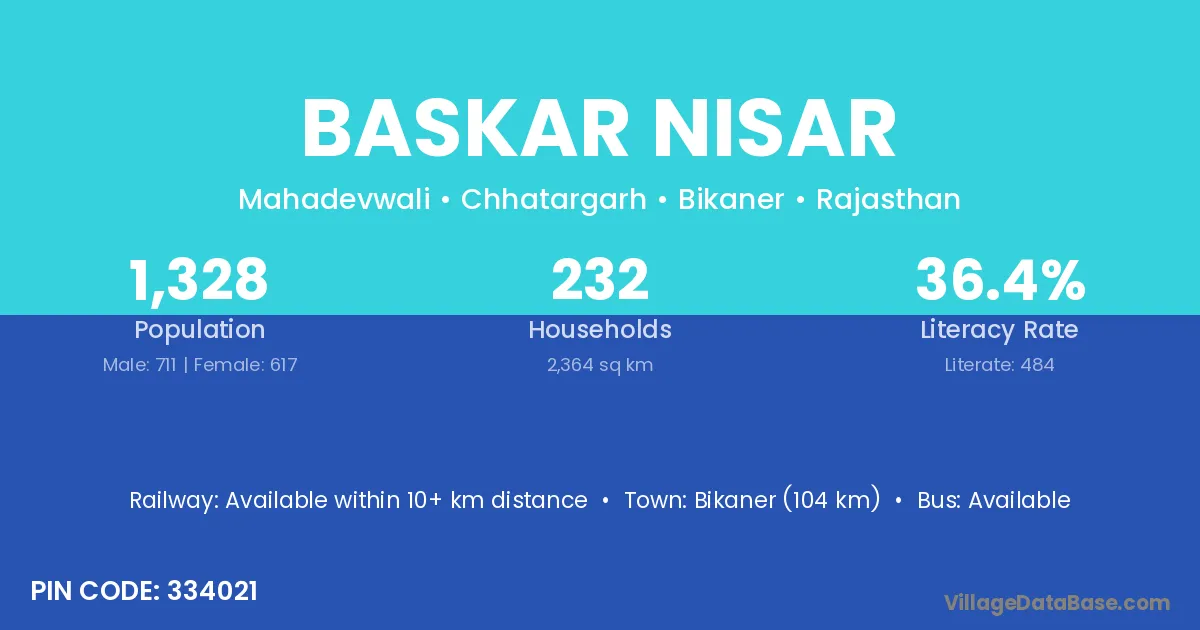 Bikaner (104 km) is the nearest town to Baskar Nisar village for major economic activities and is located approximately 104 km away.