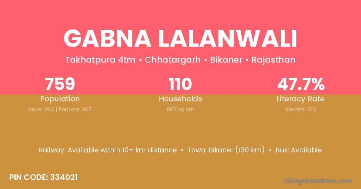 Bikaner (130 km) is the nearest town to Gabna Lalanwali village for major economic activities and is located approximately 130 km away.