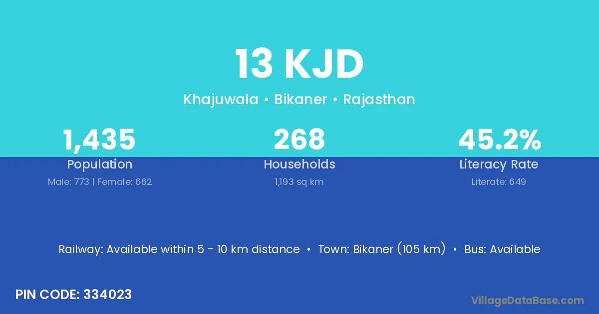 Bikaner (105 km) is the nearest town to 13 Kjd village for major economic activities and is located approximately 105 km away.