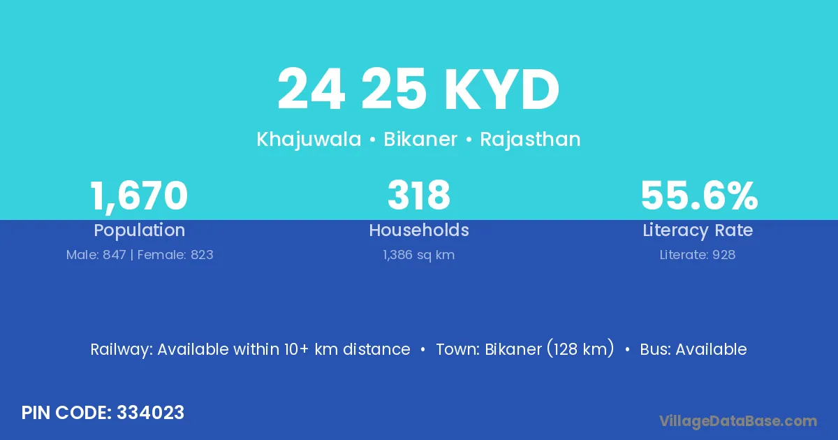 Bikaner (128 km) is the nearest town to 24 25 Kyd village for major economic activities and is located approximately 128 km away.