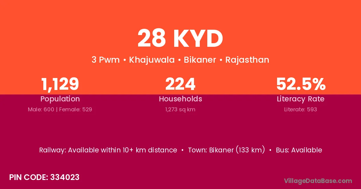 Bikaner (133 km) is the nearest town to 28 Kyd village for major economic activities and is located approximately 133 km away.