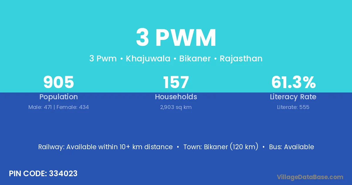 Bikaner (120 km) is the nearest town to 3 Pwm village for major economic activities and is located approximately 120 km away.