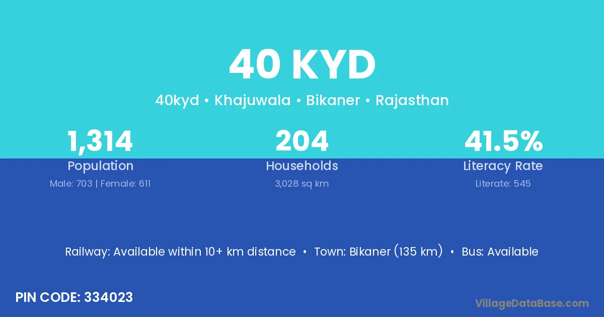 Bikaner (135 km) is the nearest town to 40 Kyd village for major economic activities and is located approximately 135 km away.
