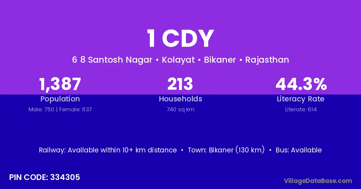 Bikaner (130 km) is the nearest town to 1 Cdy village for major economic activities and is located approximately 130 km away.