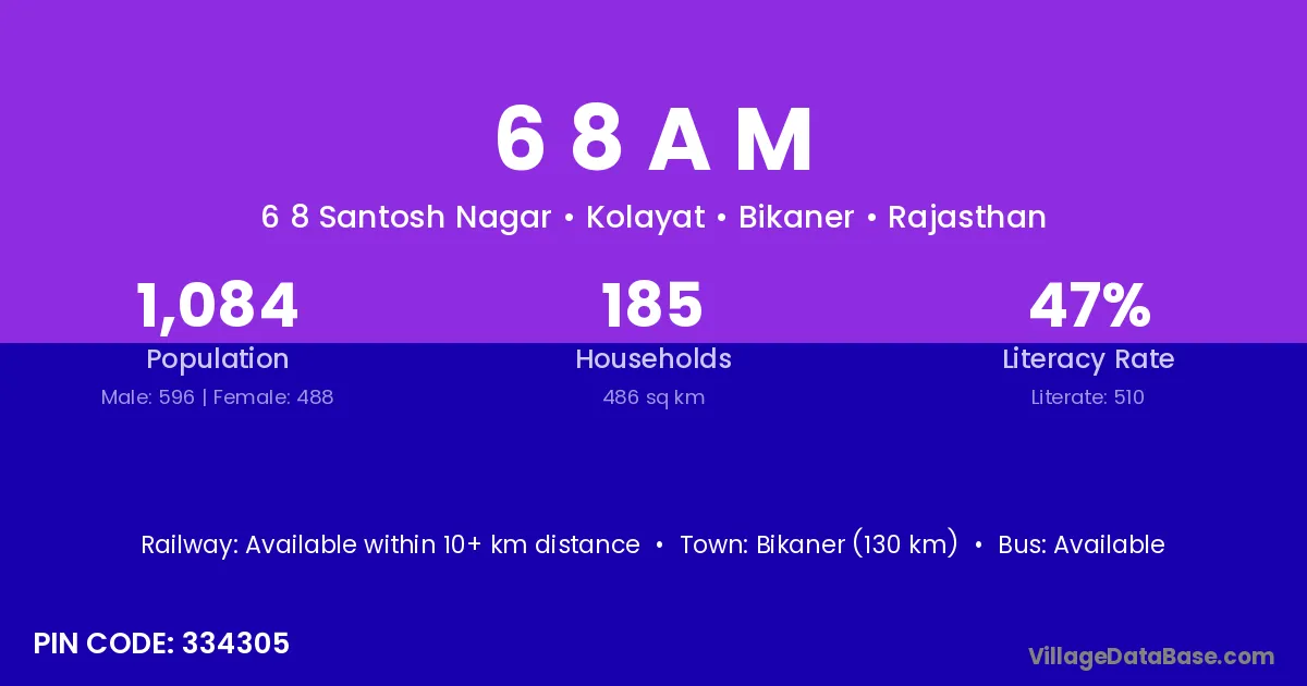 Bikaner (130 km) is the nearest town to 6 8 A M village for major economic activities and is located approximately 130 km away.
