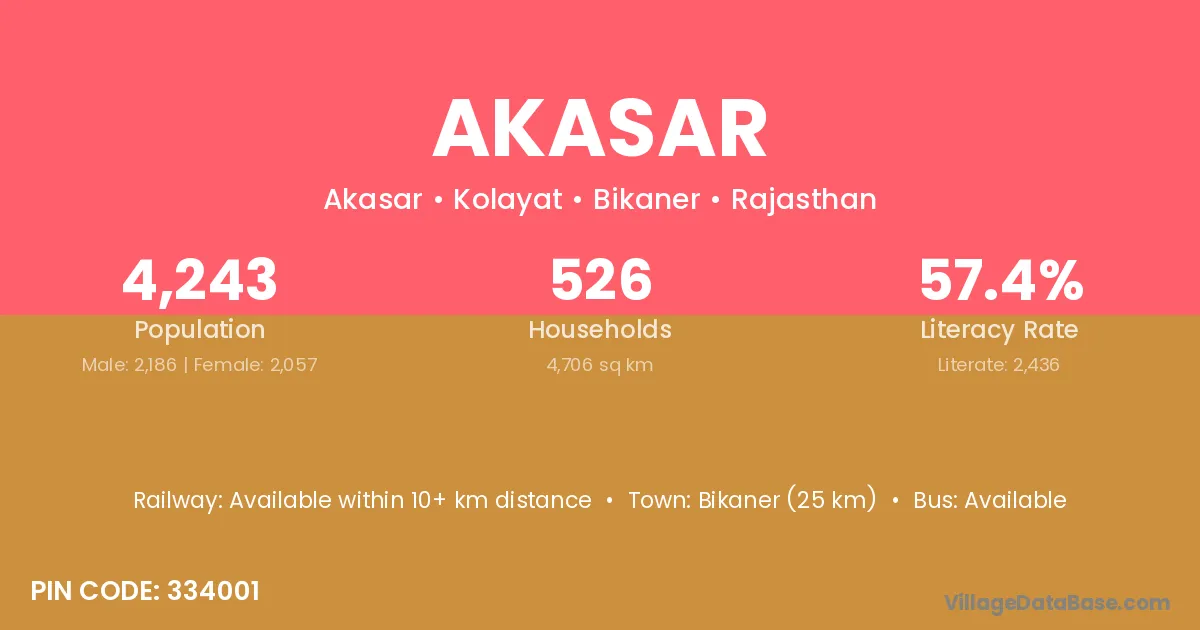 Bikaner (25 km) is the nearest town to Akasar village for major economic activities and is located approximately 25 km away.