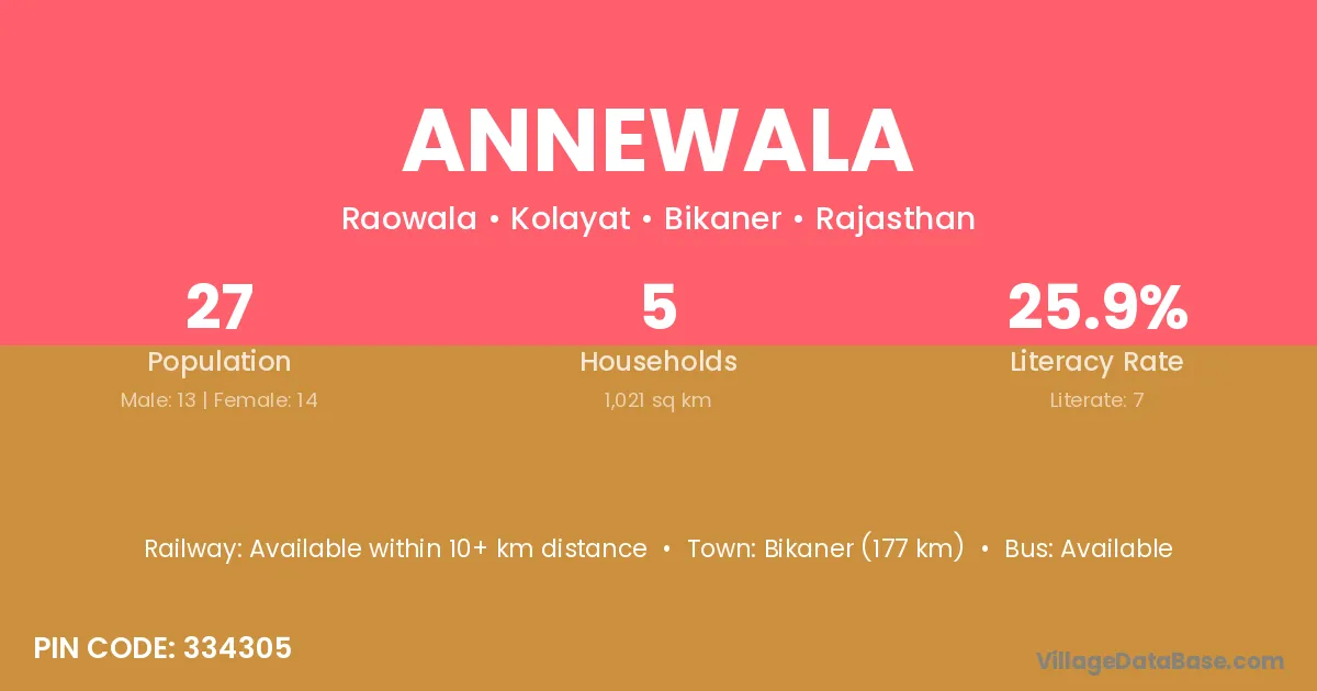 Annewala village has a total population of 27 people, of which 13 are males and 14 are females.