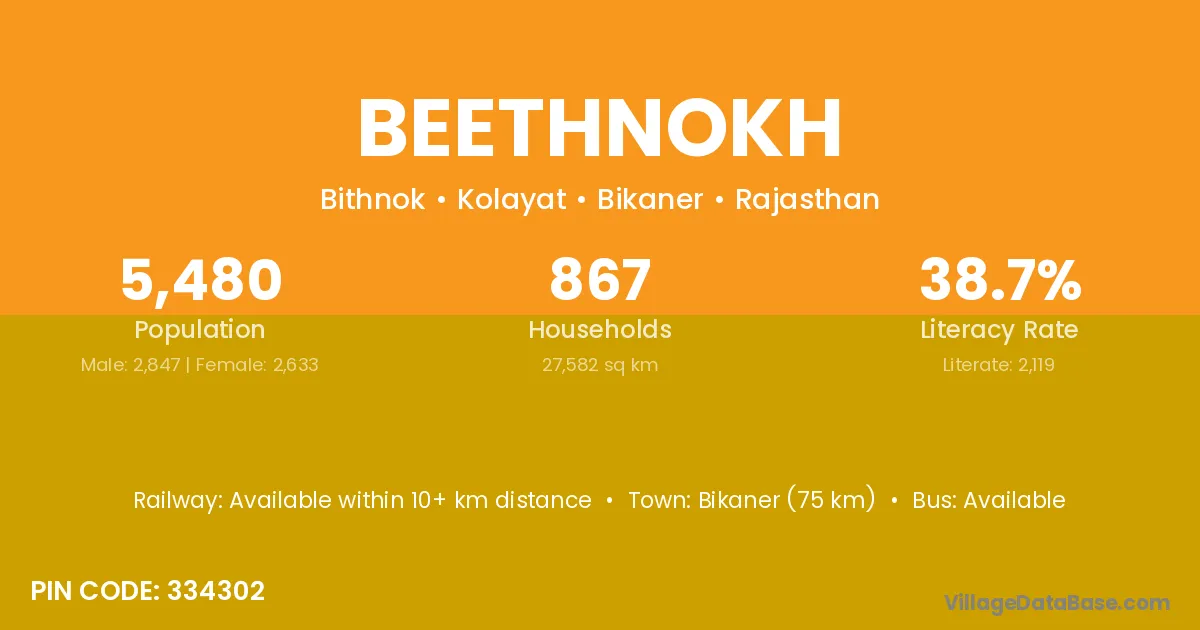 Bikaner (75 km) is the nearest town to Beethnokh village for major economic activities and is located approximately 75 km away.