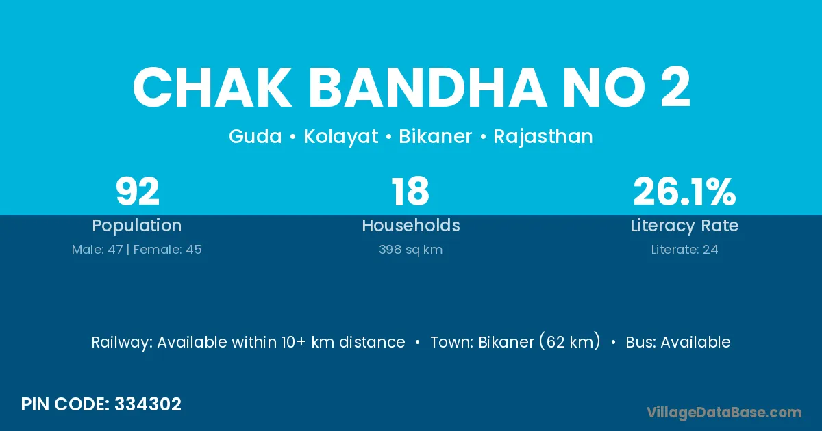 Bikaner (62 km) is the nearest town to Chak Bandha No 2 village for major economic activities and is located approximately 62 km away.