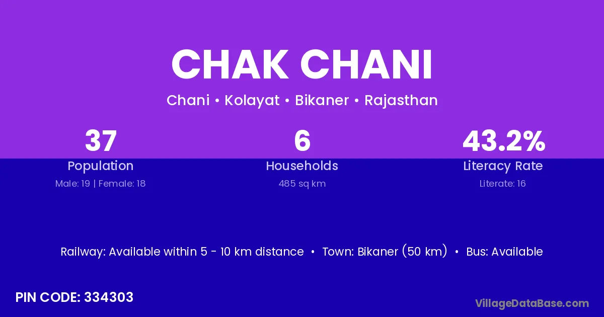 Bikaner (50 km) is the nearest town to Chak Chani village for major economic activities and is located approximately 50 km away.