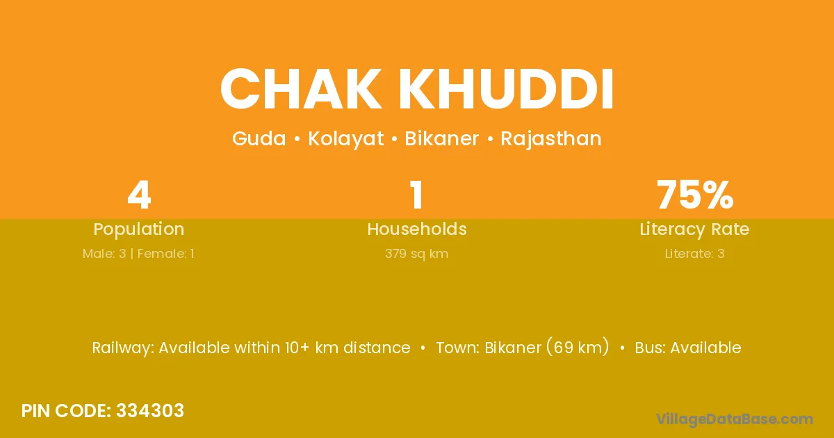 Chak Khuddi village has a total population of 4 people, of which 3 are males and 1 are females.