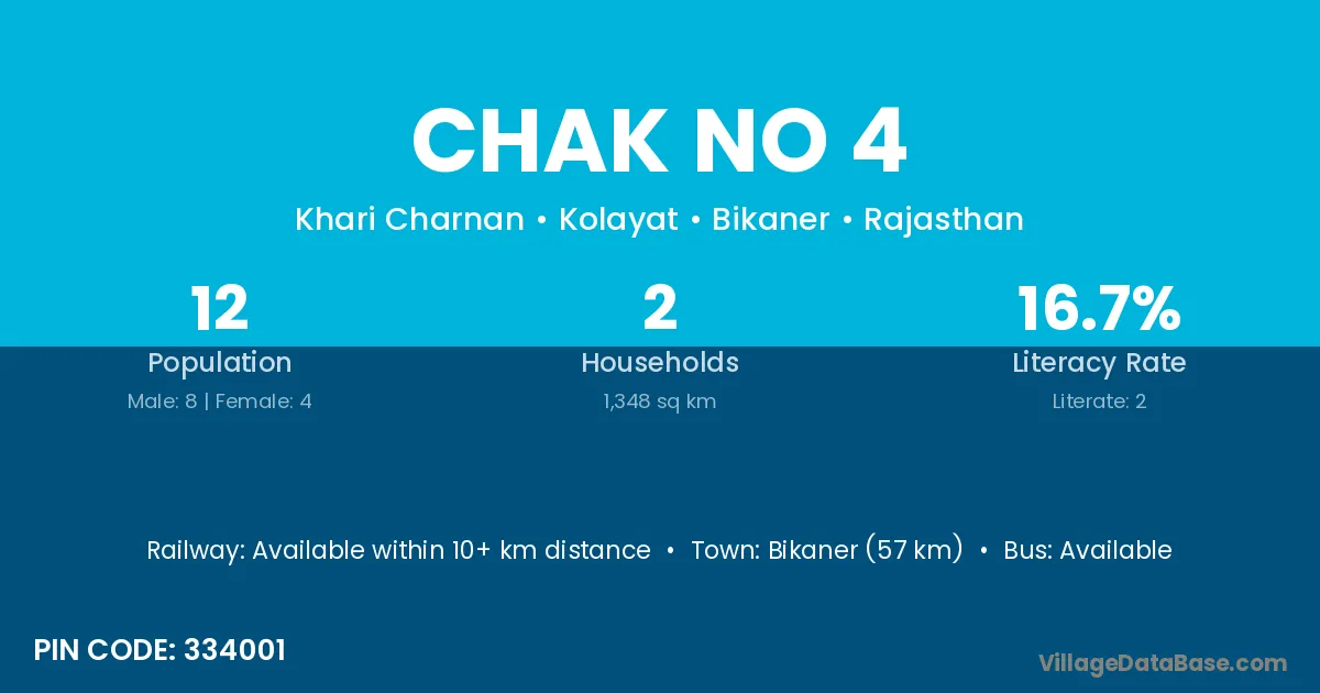 Bikaner (57 km) is the nearest town to Chak No 4 village for major economic activities and is located approximately 57 km away.