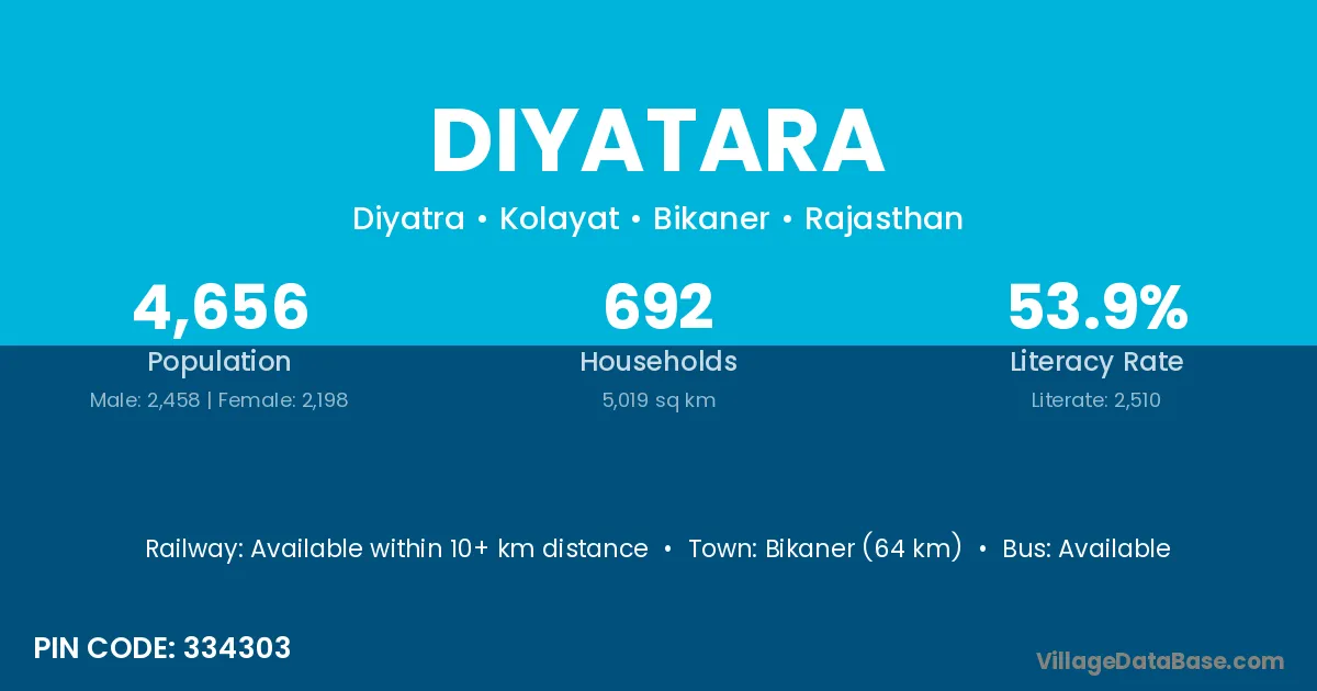 Bikaner (64 km) is the nearest town to Diyatara village for major economic activities and is located approximately 64 km away.