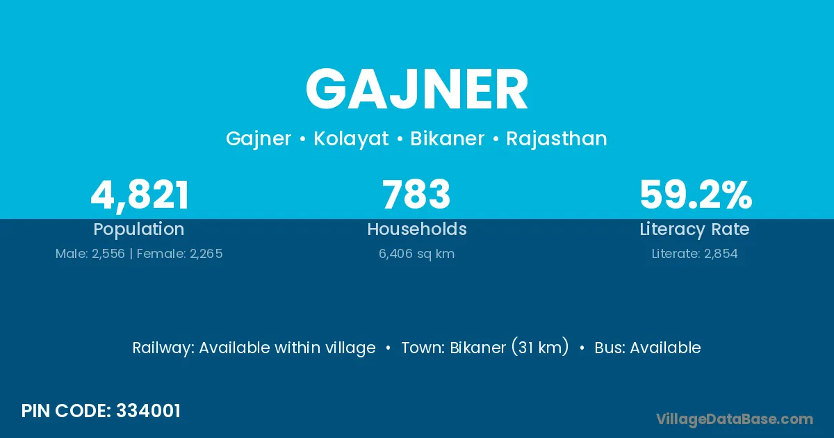 Bikaner (31 km) is the nearest town to Gajner village for major economic activities and is located approximately 31 km away.