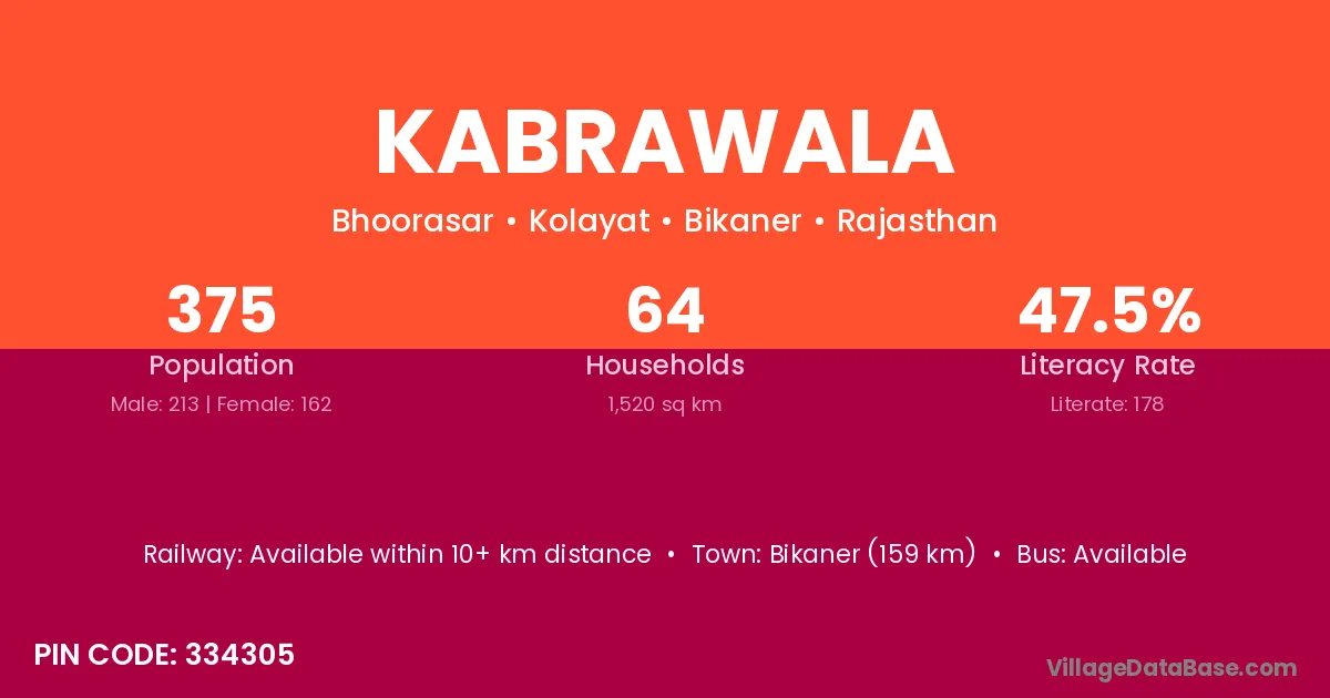 Bikaner (159 km) is the nearest town to Kabrawala village for major economic activities and is located approximately 159 km away.
