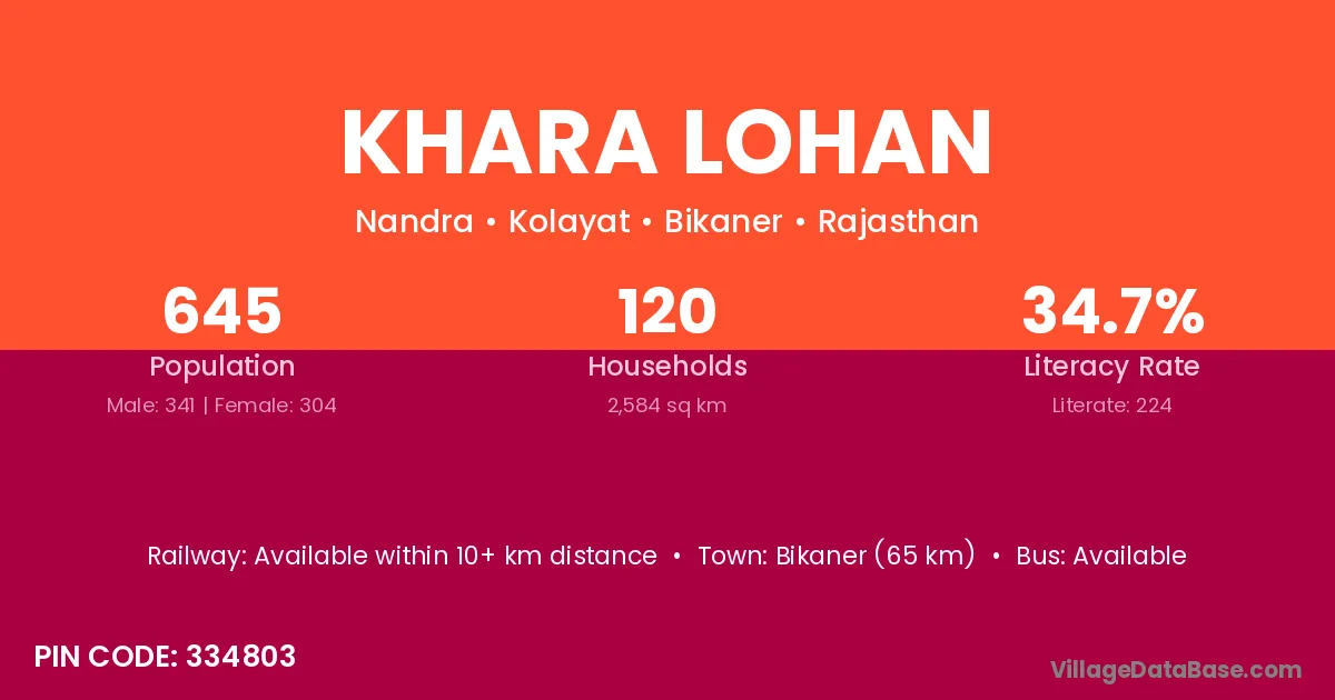 Bikaner (65 km) is the nearest town to Khara Lohan village for major economic activities and is located approximately 65 km away.