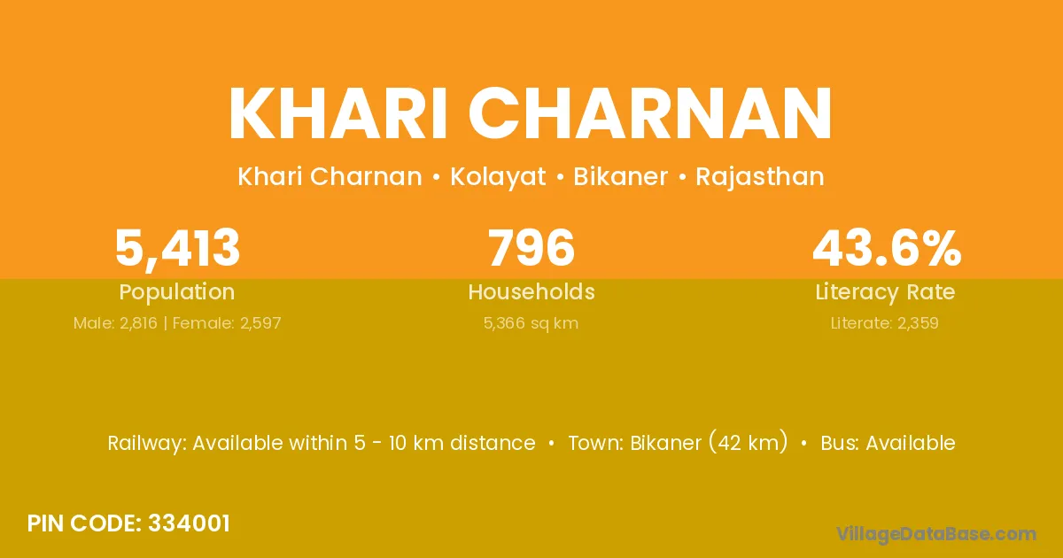 Bikaner (42 km) is the nearest town to Khari Charnan village for major economic activities and is located approximately 42 km away.