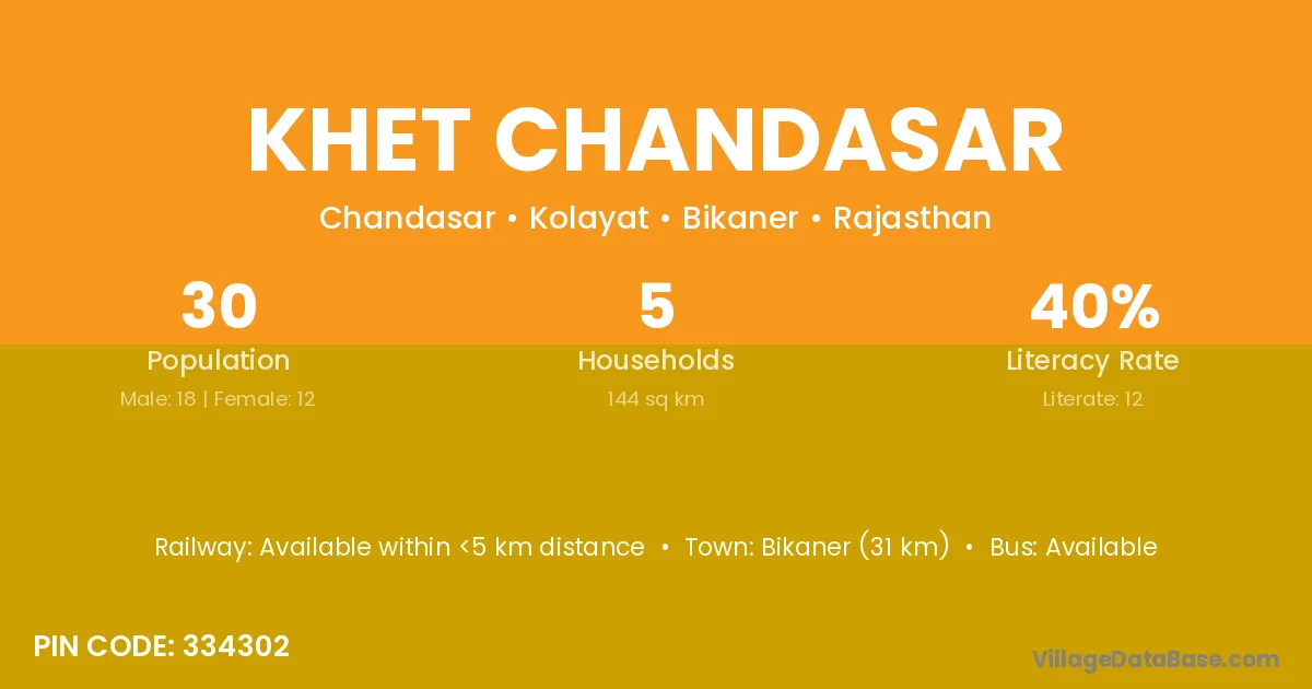 Khet Chandasar village has a total population of 30 people, of which 18 are males and 12 are females.