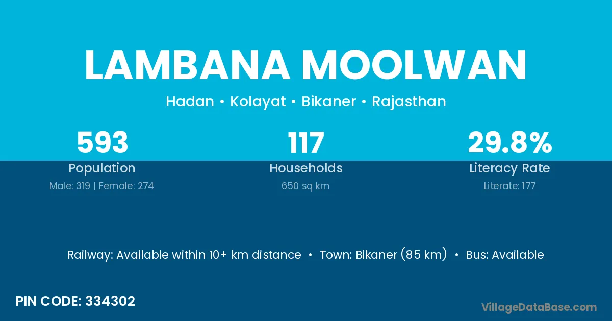 Bikaner (85 km) is the nearest town to Lambana Moolwan village for major economic activities and is located approximately 85 km away.