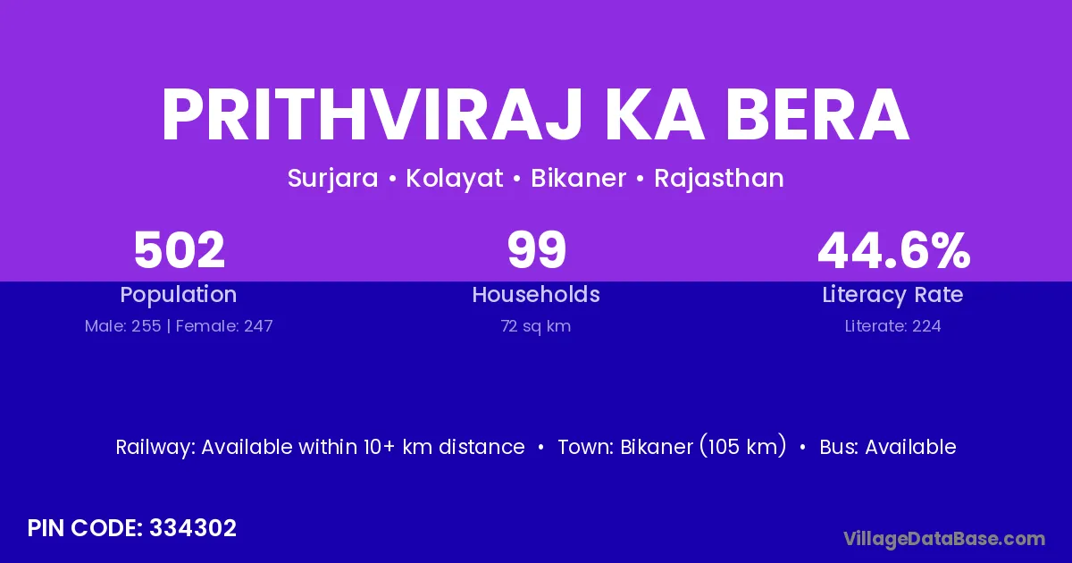 Prithviraj Ka Bera village has a total population of 502 people, of which 255 are males and 247 are females.