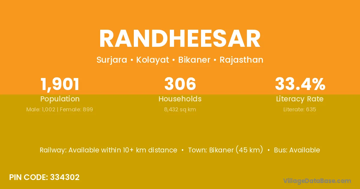 Bikaner (45 km) is the nearest town to Randheesar village for major economic activities and is located approximately 45 km away.