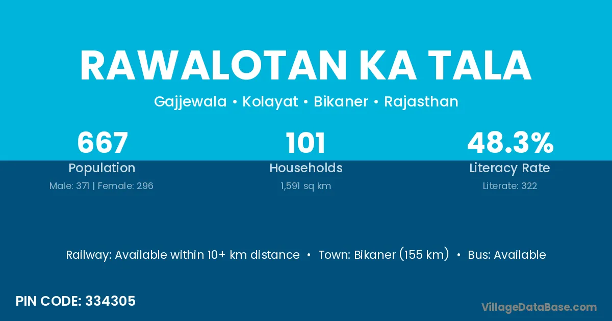 Bikaner (155 km) is the nearest town to Rawalotan Ka Tala village for major economic activities and is located approximately 155 km away.