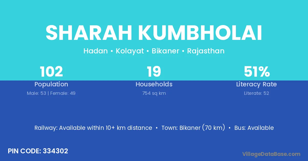 Bikaner (70 km) is the nearest town to Sharah Kumbholai village for major economic activities and is located approximately 70 km away.