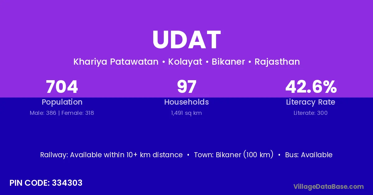 Bikaner (100 km) is the nearest town to Udat village for major economic activities and is located approximately 100 km away.